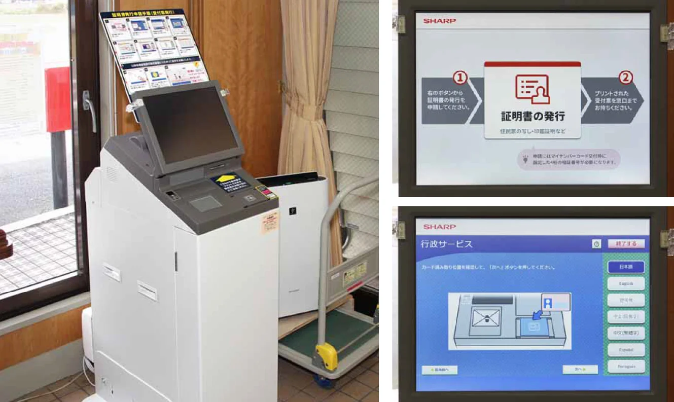 行政キオスク端末は、住民が庁舎内で証明書をセルフ発行できる端末です。