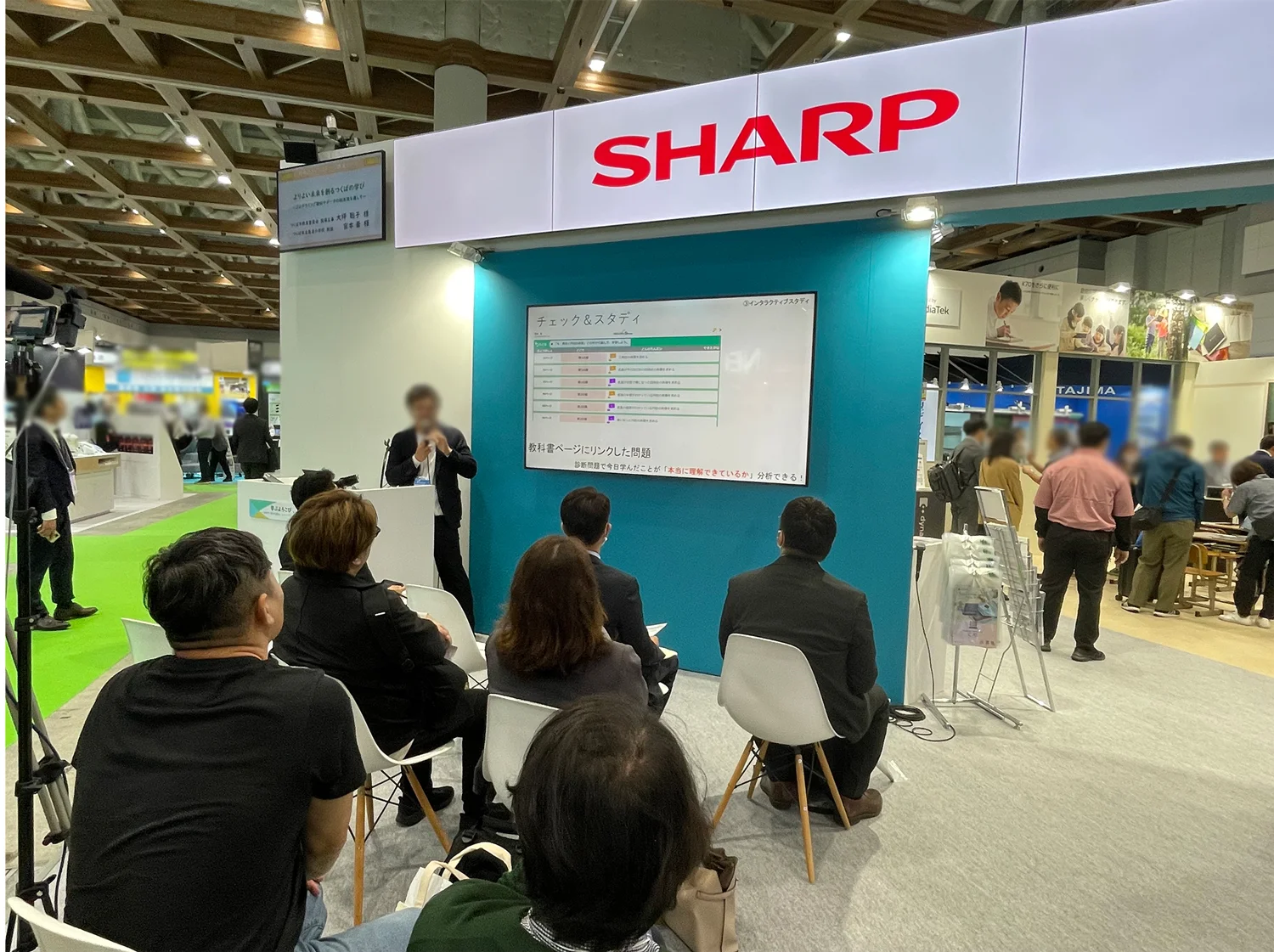 シャープは30年以上前からICT教育に取り組み、児童・生徒一人ひとりに合わせた学習支援や環境設備の構築をサポートしてきました。今年は、「学びの質の向上」、「充実した学校生活」、「先端教育の創出」の3つのゾーンで最新ソリューションを展示。ブース内プレゼンテーションステージでは、シャープのソリューションを活用したセミナーも多数開催し、多くの皆さまにご関心、ご聴講いただきました。