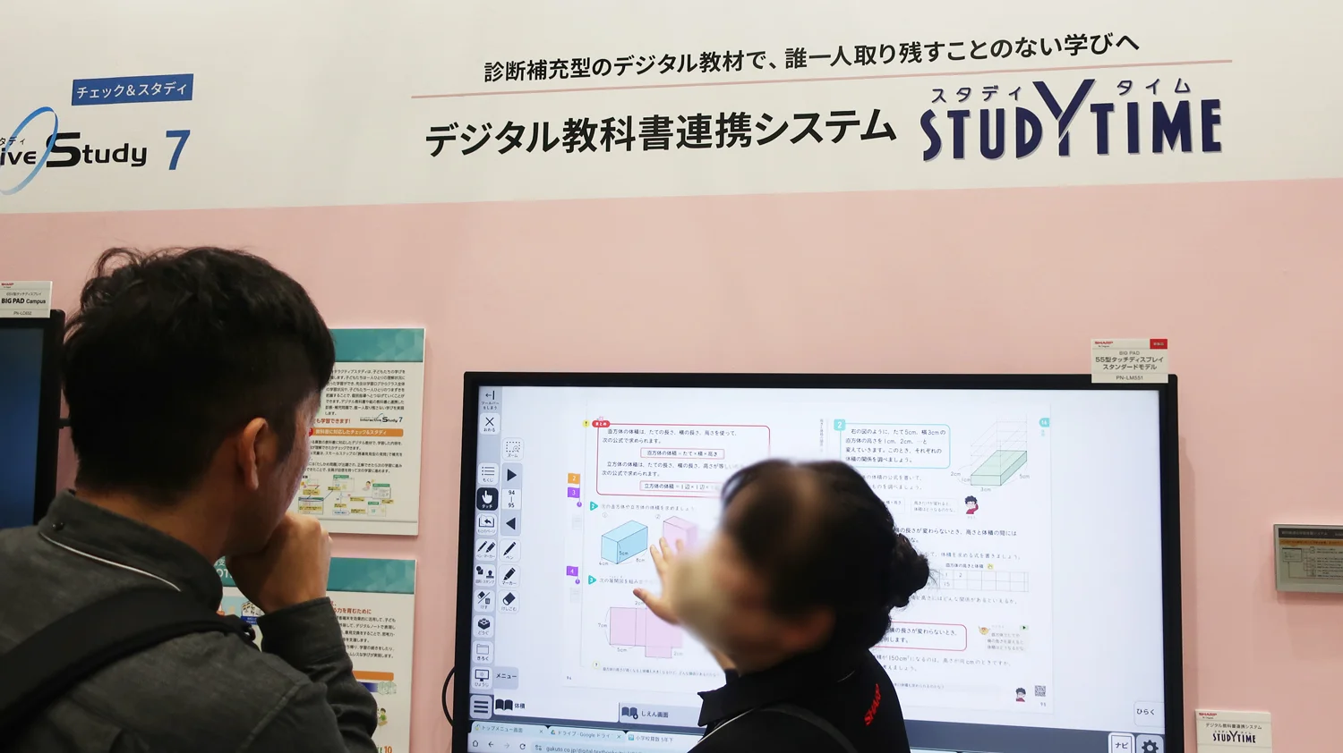 クラウドサービスの“個別最適化学習支援システム インタラクティブスタディ7 は、子ども一人ひとりにとって「わかる」を実感できる学びが特長です。 理解状況に応じてその子に適した学習内容・補充に導きます。普段使っている算数の教科書に対応したデジタル教材を利用することで実現できる誰一人取り残さない学びが注目されました。紙の教科書だけでなく、デジタル教科書と連携ができる、“デジタル教科書連携システム スタディタイムも来場者の関心を集めていました。