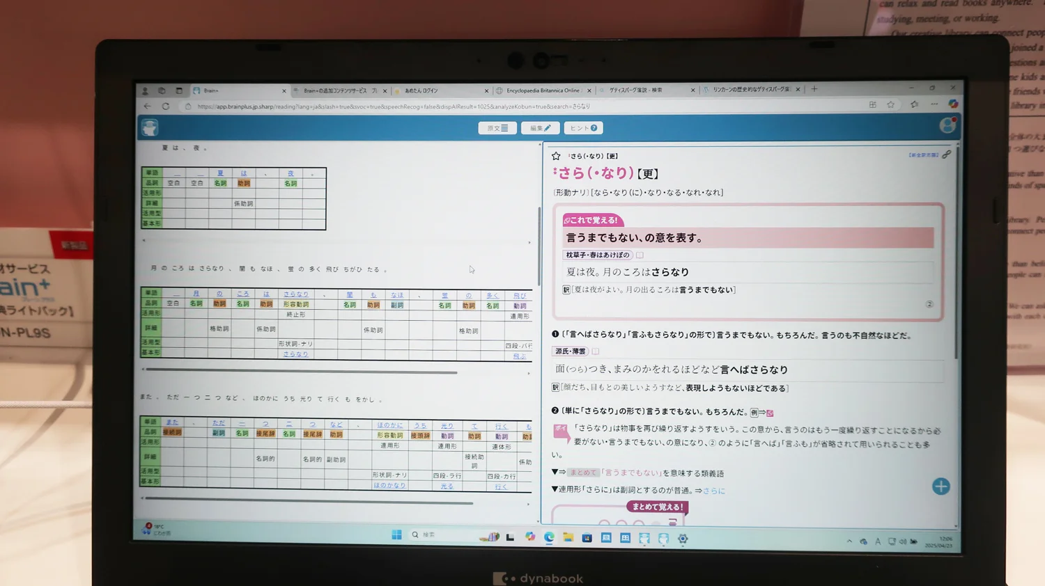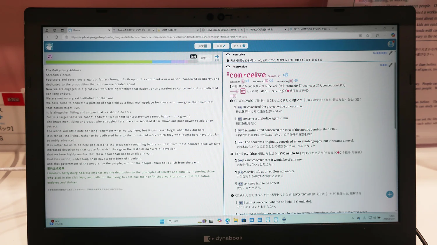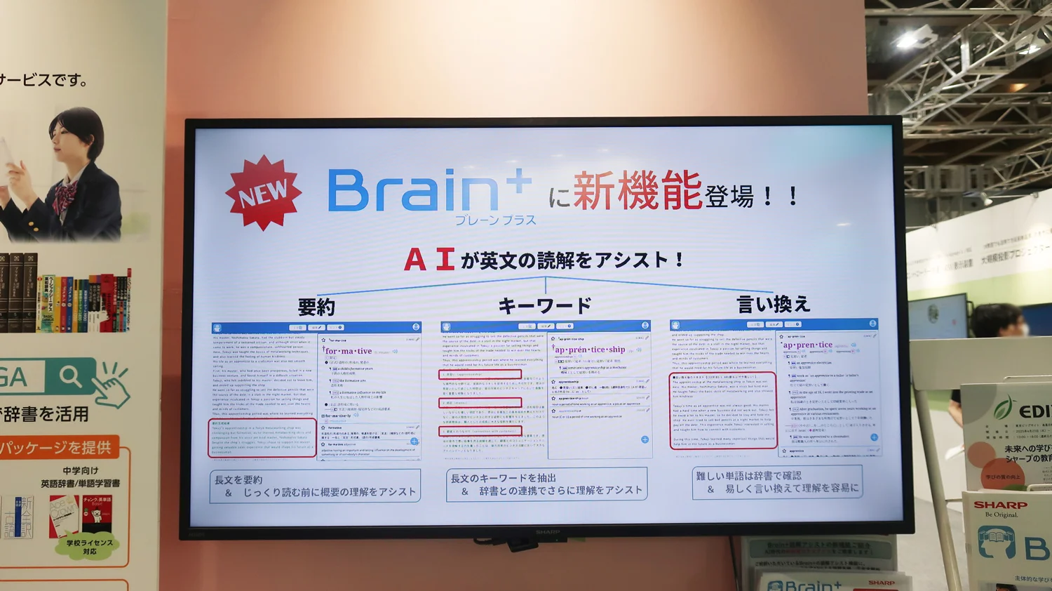 中・高校生向けの辞書教材サービス「Brain+(ブレーンプラス)」では、 シャープ独自の特長「読解アシスト」にAIを導入した新機能「英文の要約生成」「長文のキーワードを抽出&辞書との連携」「難しい単語を易しく言い換えて英文理解を支援」を紹介しました。
