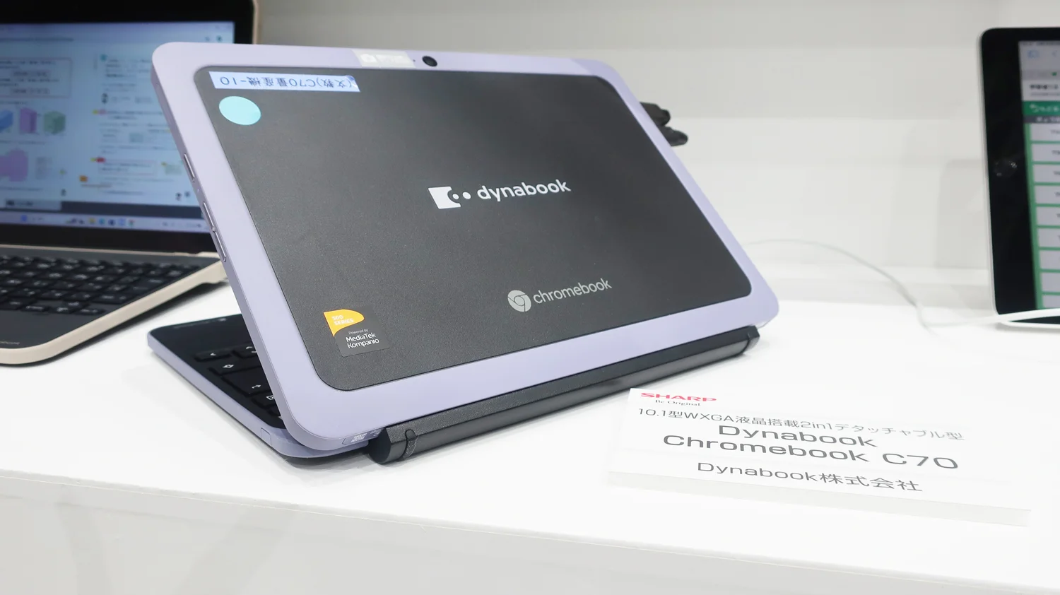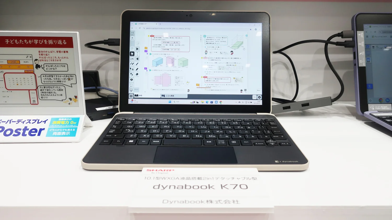 とことん「子ども目線」で開発したdynabookの学習用端末は、落下などの衝撃に対する堅牢性と使いやすさを追求。シャープ展示エリアの各コーナーに置き、活用シーンをご紹介しました。