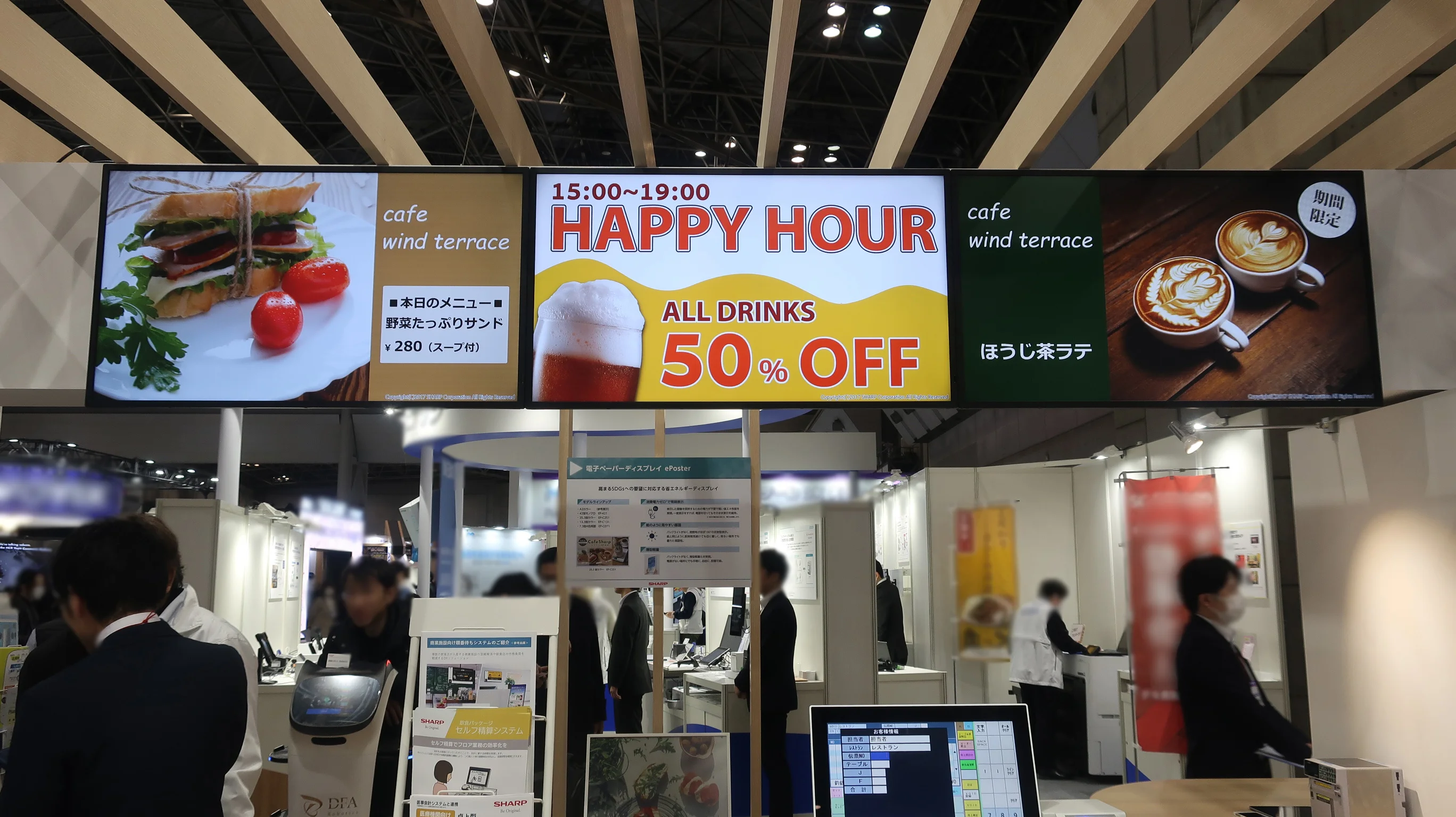 飲食店の店頭に設置されているメニューボードは、提供メニューやお店のおすすめ情報を伝えるだけでなく、お客様を店内に誘導する役割も担っているそうです。インフォメーションディスプレイは、シンプルな配線で複数台にまたがる映像表示や、書き換えの制御が可能とのこと。飲食店の店頭に3面のメニューボードの設置例を展示していました。