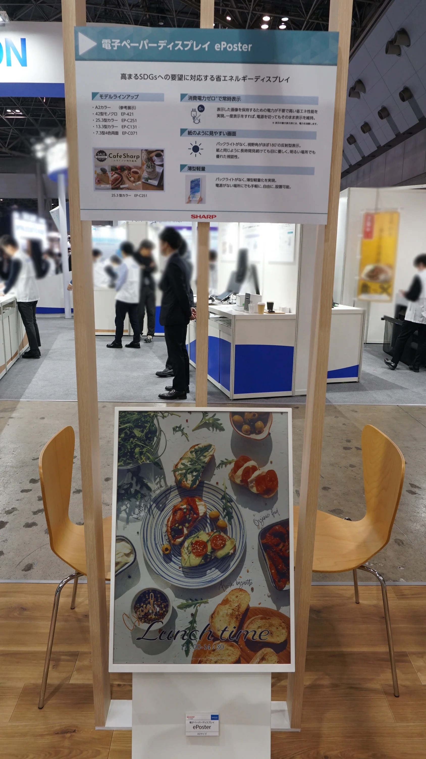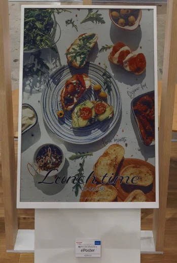 デジタルサイネージの設置が難しい場所や、紙のポスターの置き換えにお悩みのお客様に、電子ペーパーディスプレイ『ePoster』をご紹介していました。“消費電力0W”で表示保持が可能であり、電力を必要とするのは表示を書き換えるときのみ。案内板や広告表示、メニュー表示など、さまざまなシーンで活躍します。