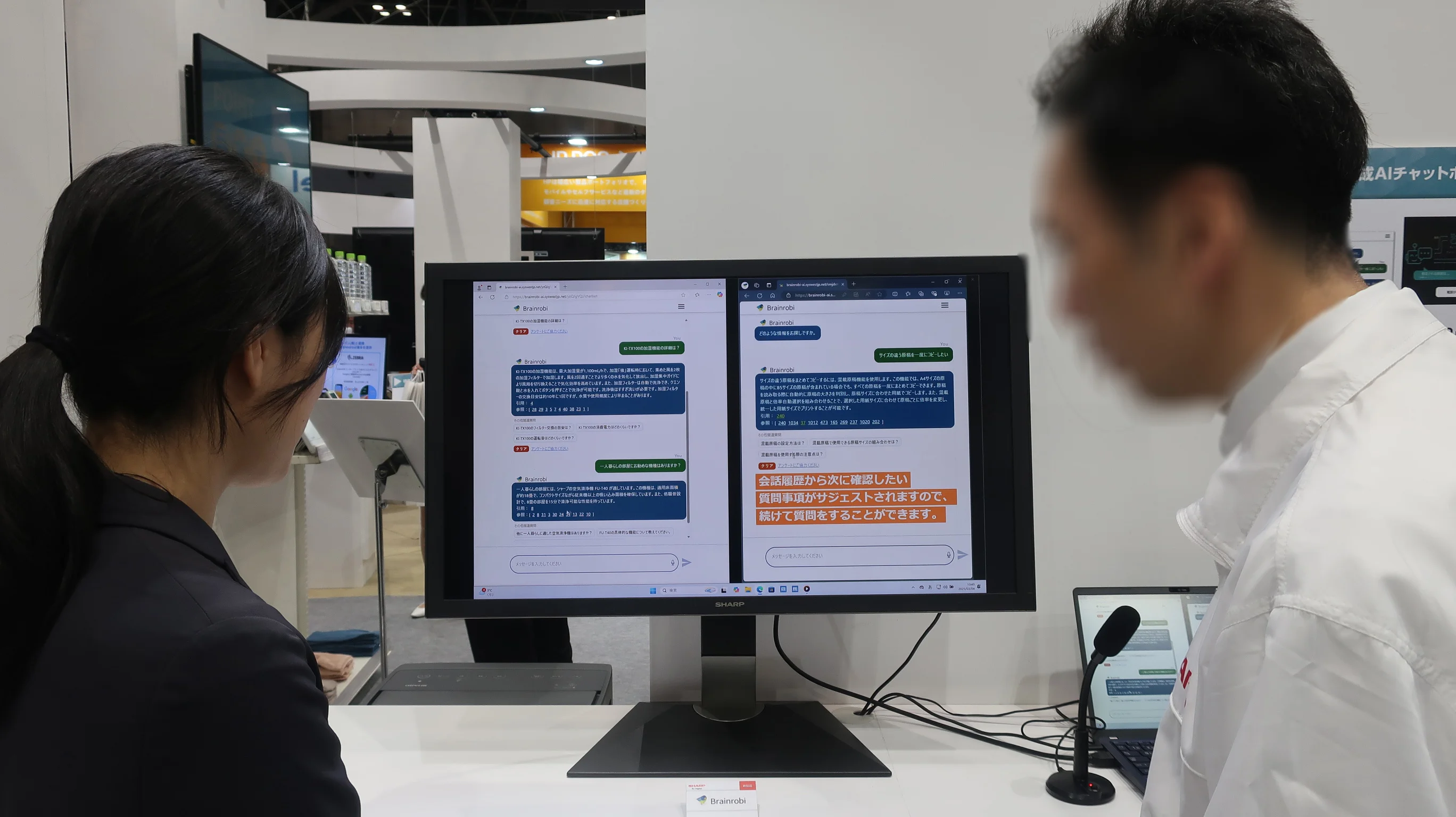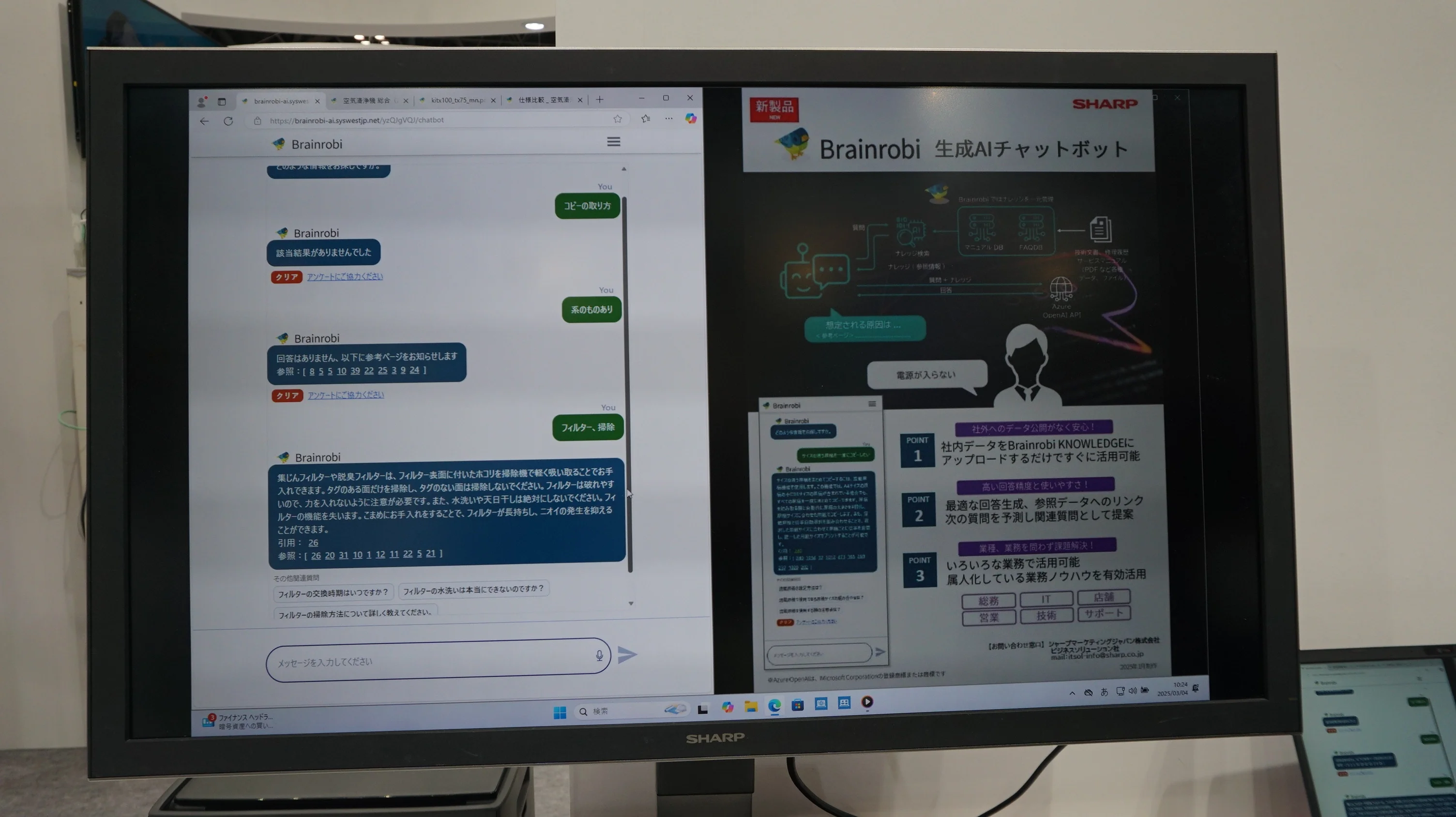 「SHARPの加湿空気清浄機器ってどんな特長があるんだろう」店舗スタッフがご来店されたお客様から聞かれた事を、BOTに質問したらすぐに答えてくれる環境を簡単に構築できるそうです。Brainrobi生成 AI チャットボットは社内データを Brainrobi KNOWLEDGE にアップロードするだけですぐに利用できるとのこと。デモンストレーションでは、質問に対する回答生成だけでなく、カタログや取扱説明書などの関連ページが画面に表示され、わかりやすかったです。将来的には、多言語や画像認識にも対応を検討しているそうです。