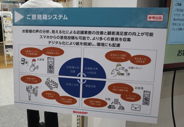 お客様のスマホから意見投稿ができ、店舗の端末で回答を入力後、サイネージに投稿意見の表示が可能なご意見箱システムも参考出品されていました。お客様への回答をサポートするAIアシスタント機能や感情分析、ワードクラウドによるトレンド分析も魅力的な機能です。