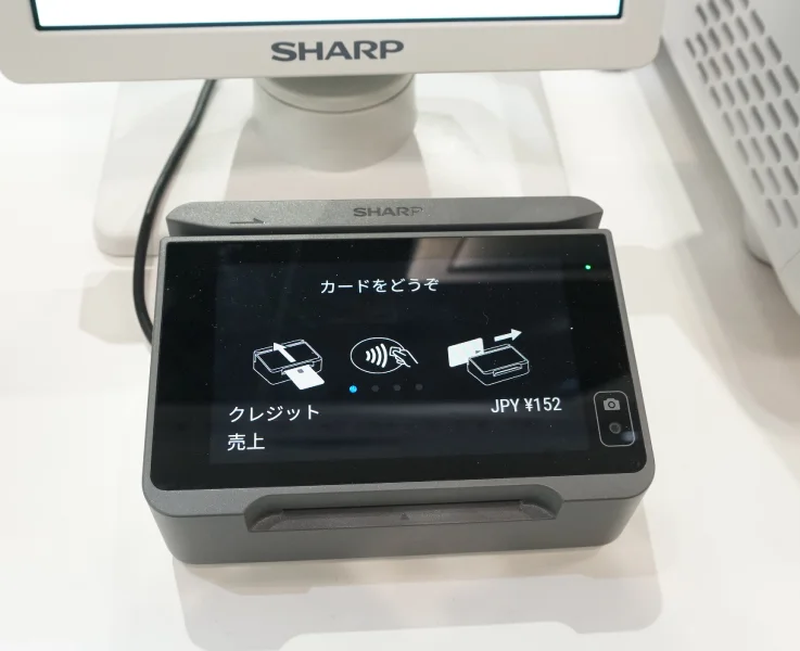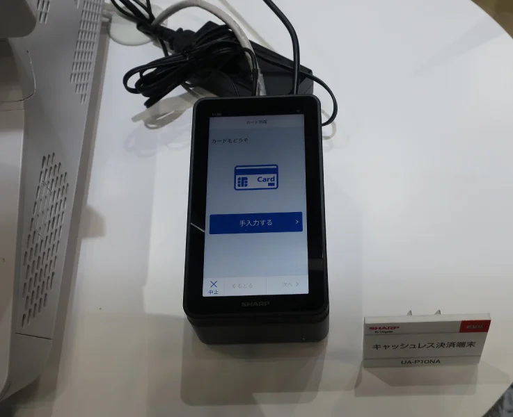 がブース入口で注目を集めていました。顧客側端末には、のぞき見を抑制するシャープ独自のベールビュー技術を採用しているそうで、斜め方向からは画面が見えないことが確認できました。一体型POSターミナルRZ-A396S