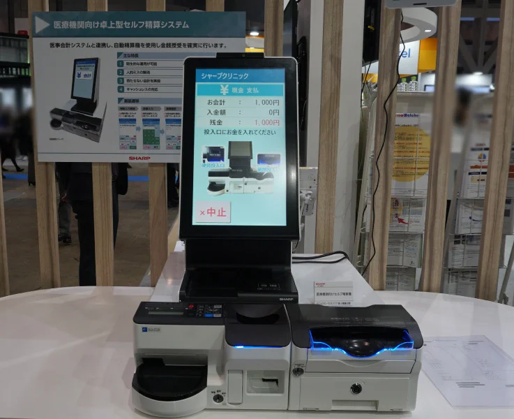 支払い待ち時間の解消と省人化に繋がるセルフ精算システムとして、医療機関向けの展示がされていました。セルフレジの課題である「お客様が操作方法がわからなくなる」を防ぐ仕組みも紹介されていました。