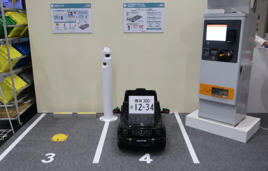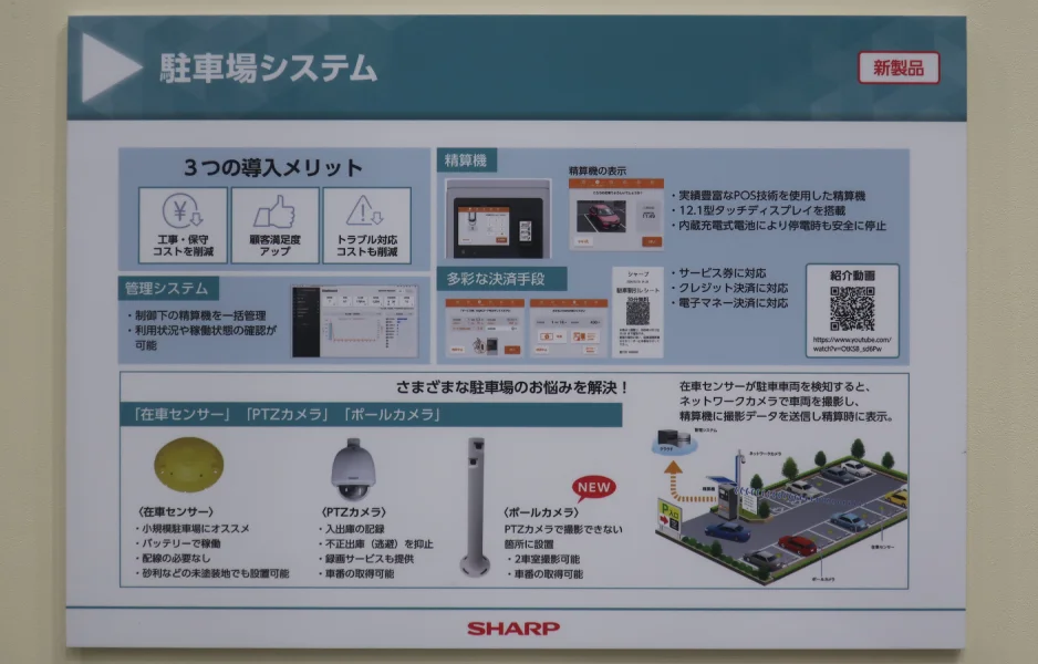 ブースでは、在車センサー・ネットワークカメラ・ポールカメラ・精算機でコインパーキングのシーン展示をしていました。ネットワークカメラと組み合わせることで、入庫した車両のカメラ画像と時刻を記録・管理が可能となり、車両画像の確認で精算ミスを防ぐこともできるそうです。