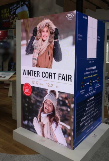 お客様の注目を店に集めるツールとして、LEDディスプレイの柱巻きも紹介していました。LEDディスプレイ D2シリーズは、シームレスな90度設置を可能にするキャビネットで、柱巻きや壁面のコーナーを活用したディスプレイ構成ができるのが特長とのことです。