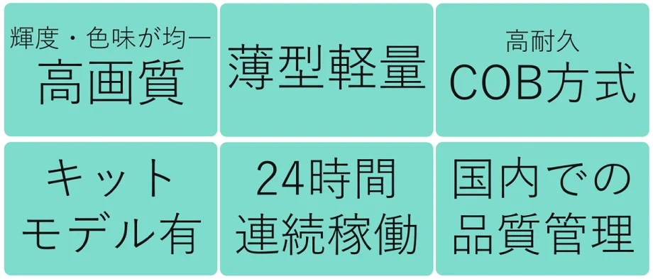 LED素子を基板に直接接着し、封止樹脂で全体を覆うCOB(Chip on Board)フリップチップ方式は、直接ピクセルカードの表面全体が樹脂で保護されているため、SMD方式に比べて外部からの衝撃や静電気、埃、水滴などへの耐性が向上しています。そのため室内通路やエントランスなど、人が触れることが想定される場所にも設置が可能です。