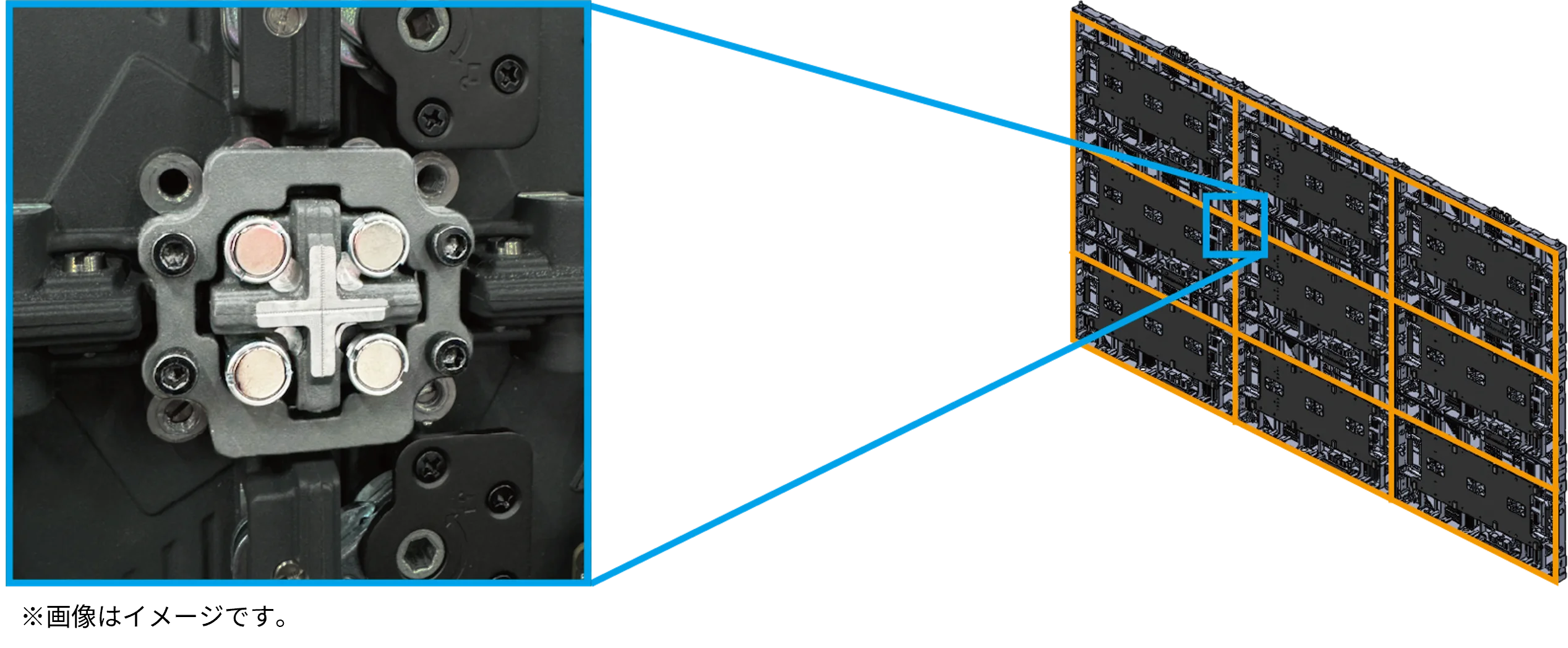 アスペクト比16:9を採用しており、フルHD解像度(1,920×1,080)や4K解像度(3,840×2,160)の画像をマルチスクリーンで表示する際は、縦横同数のモジュールを組み合わせることで構成できます。