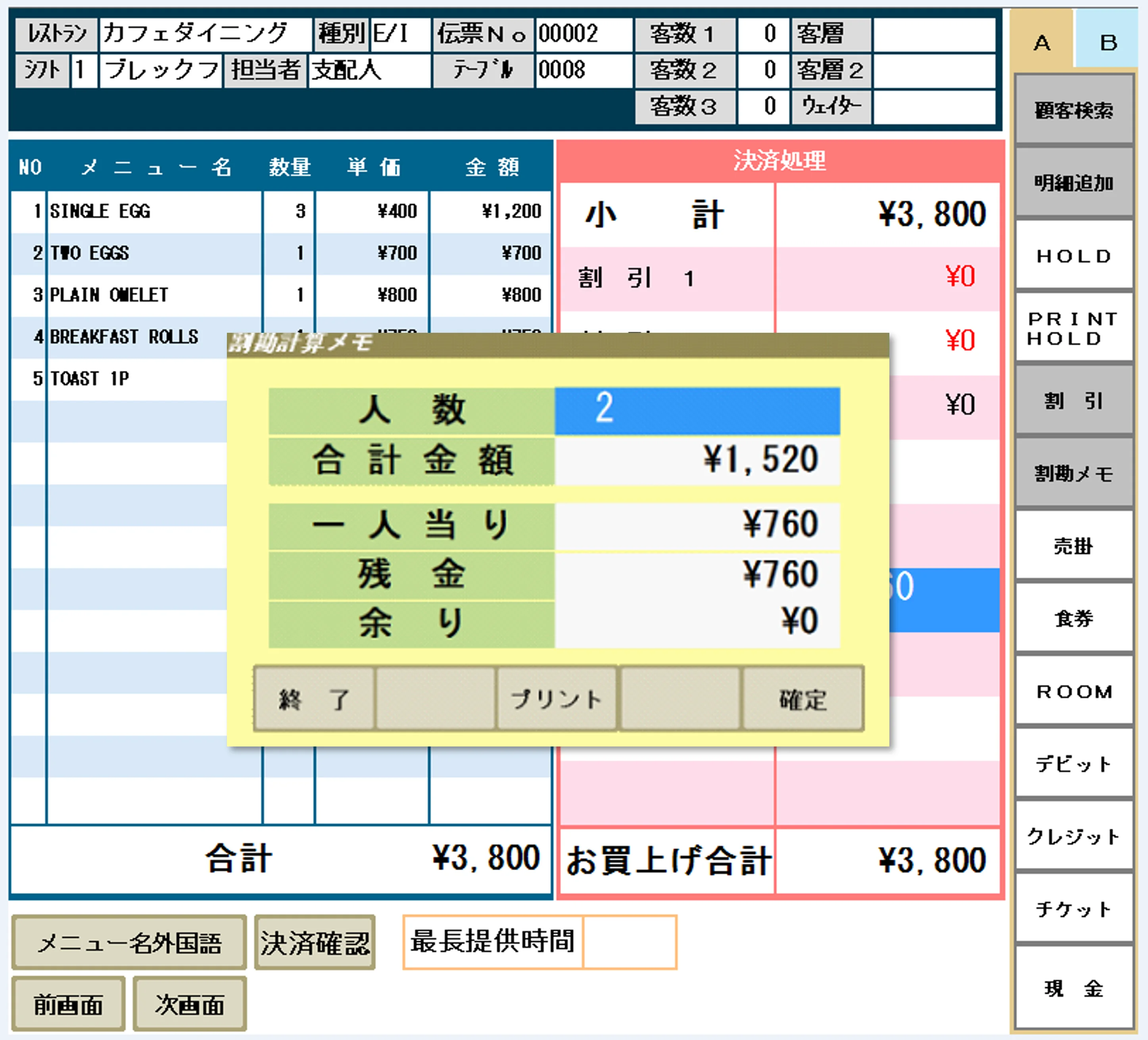 合計金額を人数で割った金額を表示。人数・一人当りの単価は任意で設定可能。 画面例※画像クリックで拡大表示
