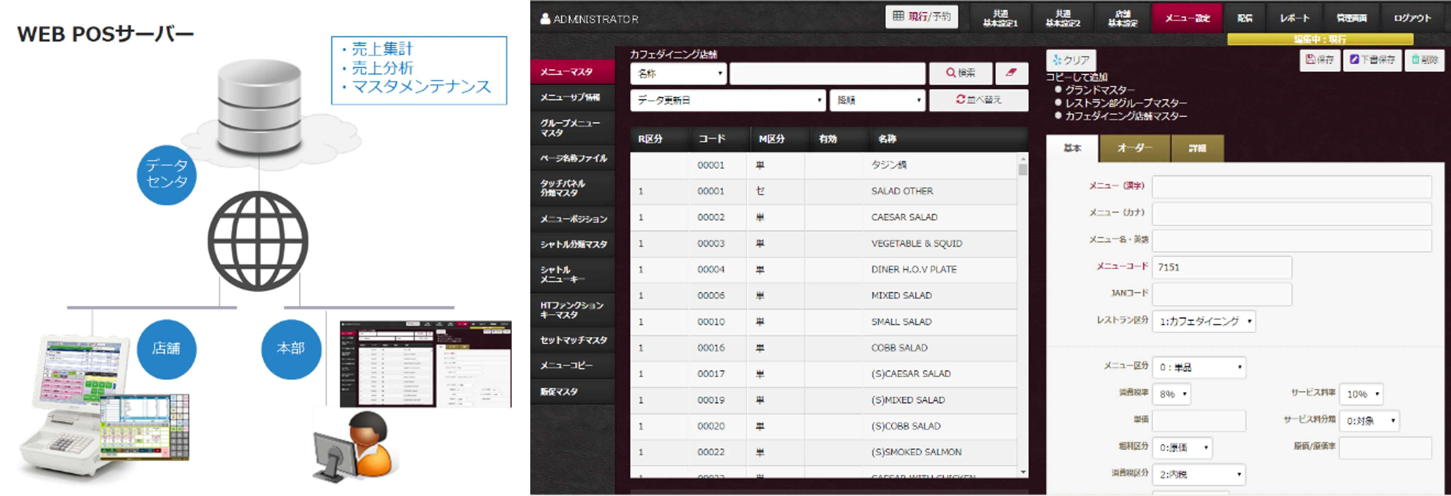 各POSターミナルを管理するPOSサーバーは、複数業態のマスタ管理、集計データの一括管理が可能です。WEBで構築をしているため、本部や店舗のパソコンからブラウザで操作ができます。
