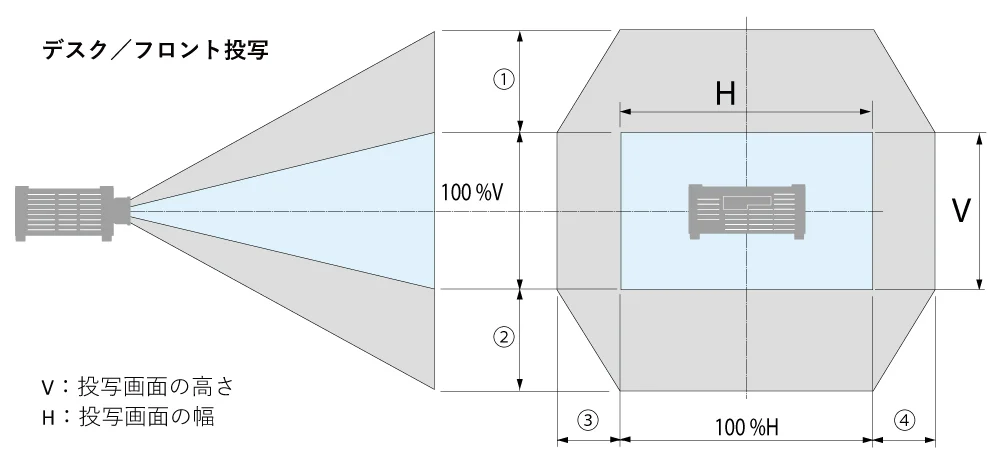 天吊り/フロント投写もレンズシフト範囲は同じです。