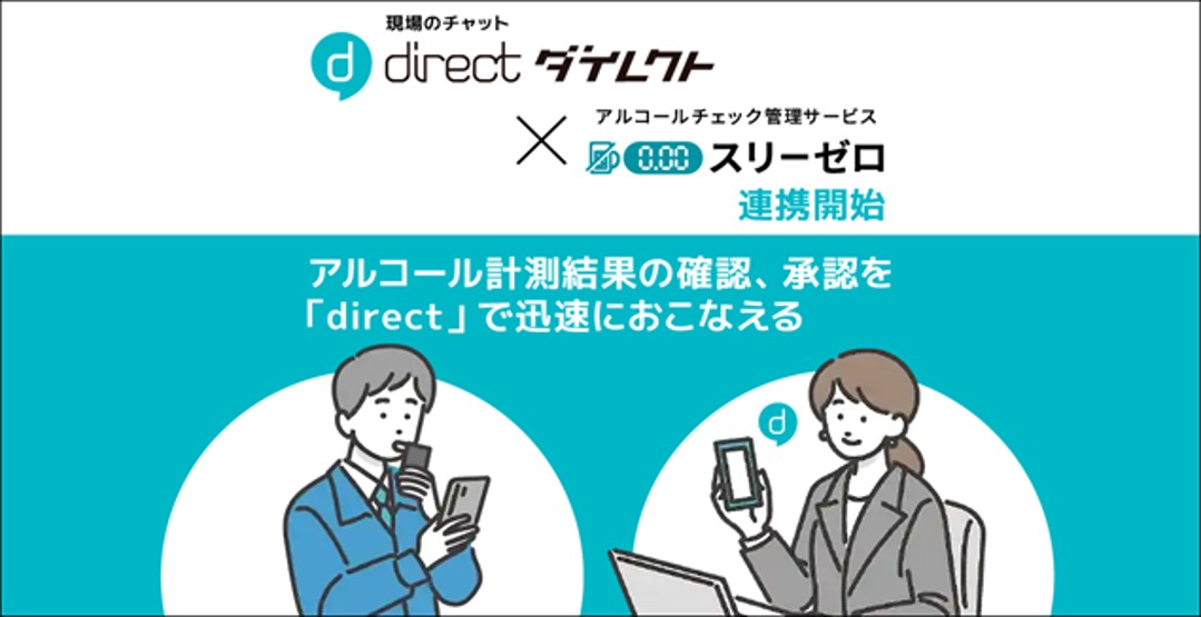 そんな課題を解決するため、シャープが提供するアルコールチェック管理サービス「スリーゼロ」は、建設現場で広く活用されているビジネスチャット「direct」と連携(※1)します。安全運転管理者は使い慣れた「direct」上でアルコールチェックも行えるようになり、迅速で効率的な管理ができるようになります。