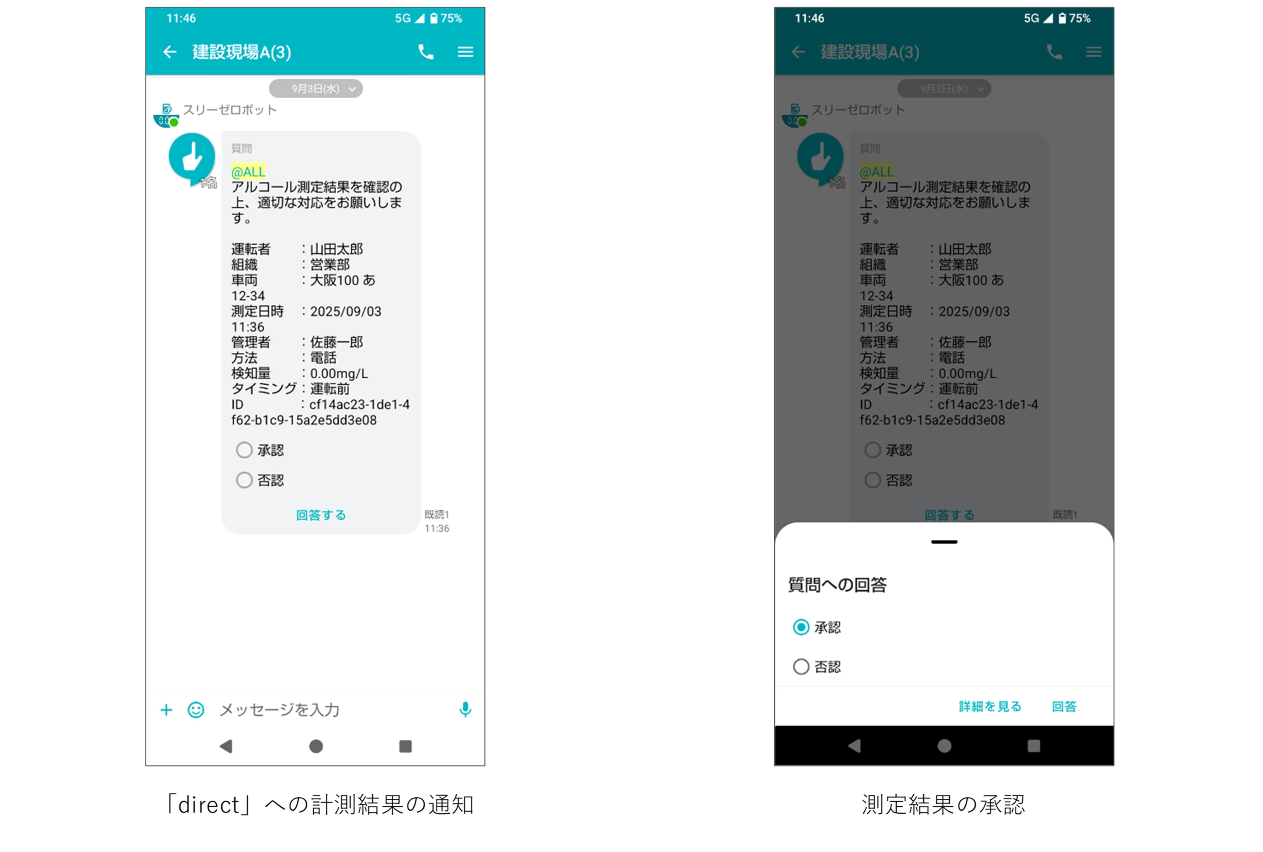 「スリーゼロ」で運転者が測定結果を送信すると、「direct」のトークルームに自動的に投稿されます。管理者は、投稿された測定結果を確認し、チェット上で迅速に承認/否認の返信をすることができるようになりました。
