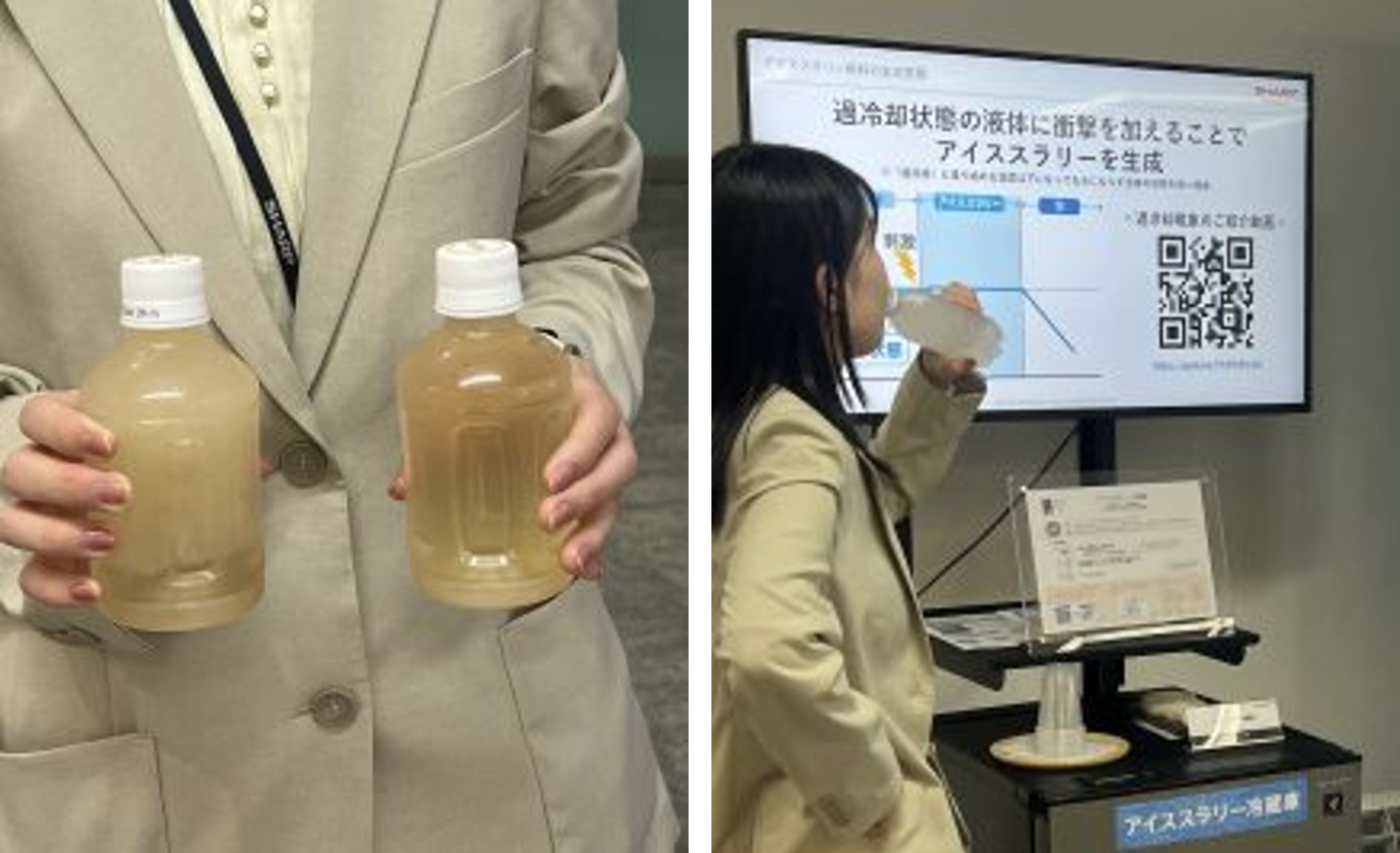 アイススラリー冷蔵庫は、シャープの法人向けショールーム「3×3 Hub」に展示(※)しています。試飲していただくこともできます。液体よりも早く身体を冷やすことを実感してください。アイススラリーを作る独自技術や作り方などもご紹介させていただきます。