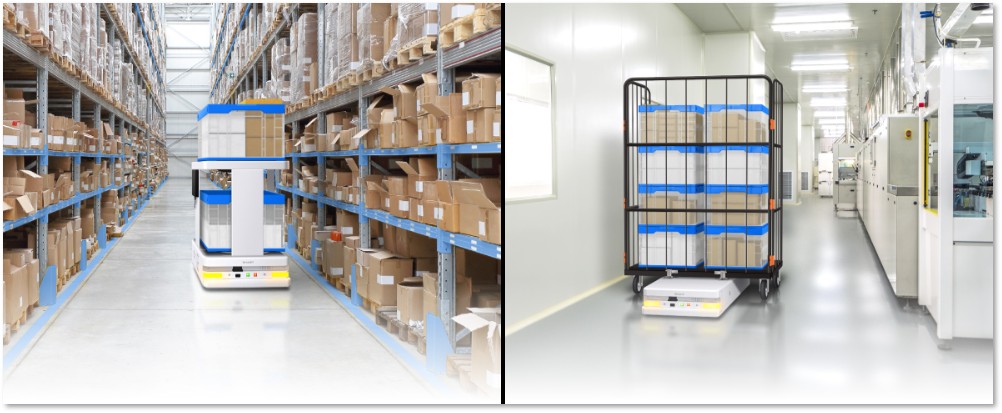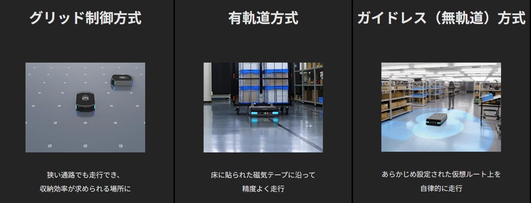 また、床に貼り付けた二次元コードに沿って走行する「グリッドタイプ」、周囲の状況をセンサーで認識して走行する「ガイドレスタイプ」、磁気テープに沿って走行する「有軌道タイプ」を、倉庫や工場の特性や運用方法などに合わせてお選びいただけます。