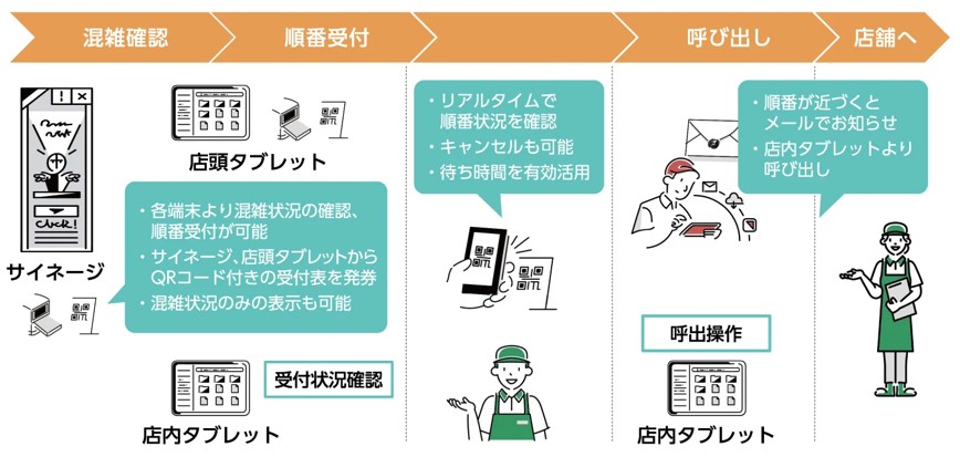 ショッピングモールでの飲食店などの混雑状況を見える化するソリューションを展示します。リアルタイムで順番を確認でき、お客様のストレス軽減と受付業務の負担軽減・自動化を実現することを提案します。