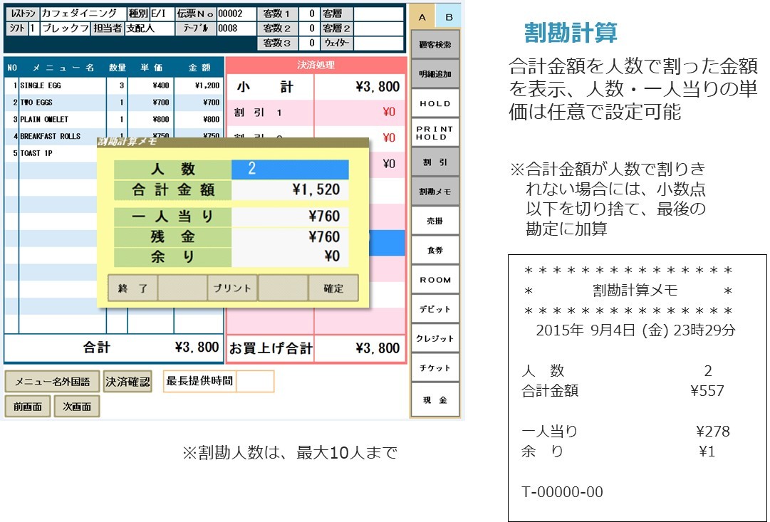 グループのお客様には割り勘の金額を提示したり、現金とカードの併用で決済したり、便利な会計機能でスムーズな処理を実現します。一度の会計で10種類までの決済に対応できます。