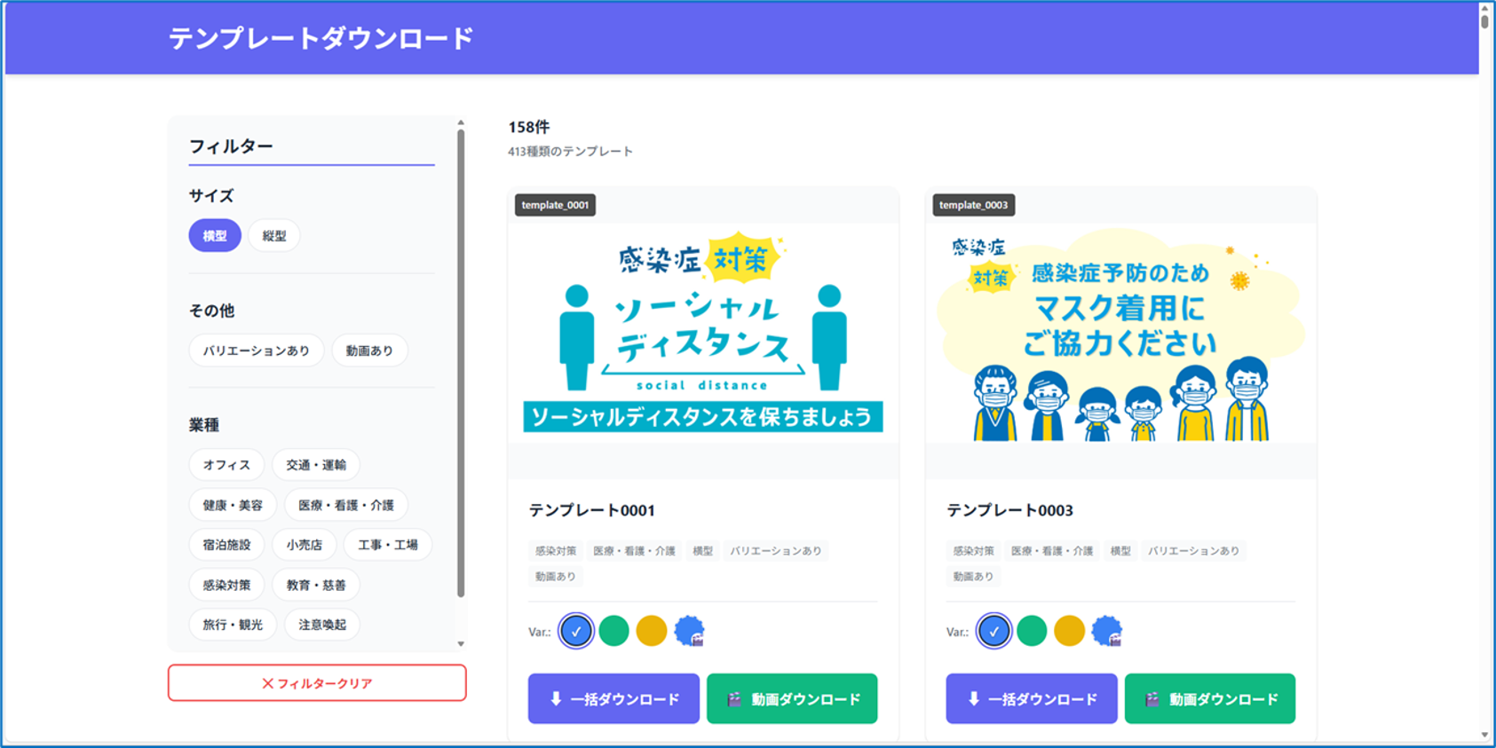 670種類の中から目的の静止画用テンプレートを探すのは大変!そんな心配はご無用です!「e-Signage S クラウドサービス」をご契約頂いたお客様には、専用のポータルサイト(メンバーズサイト)をご提供しています。テンプレートダウンロードページでは、縦横、業種・シーンなどの条件で簡単に絞り込みができ、サムネイルを確認しながら最適なテンプレートをすぐに見つけることができます。
