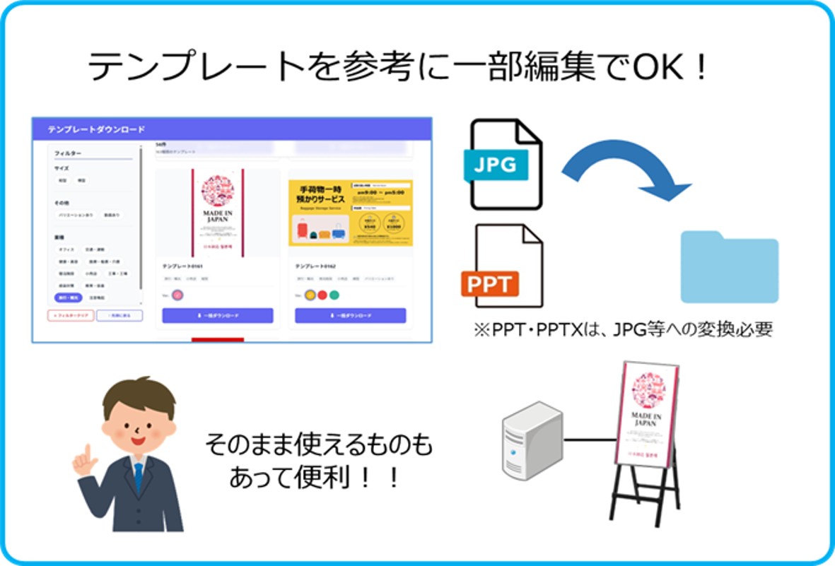 合計670種類のテンプレートから、使用目的やシーンに合わせて選択し、簡単にオリジナルコンテンツを制作できます。静止画テンプレートは、そのまま使用可能な静止画(.jpg)ファイルとパワーポイント(.pptx)ファイルでご提供。さらに、オンラインで視聴できる操作講習動画も用意していますので、専任担当者でなくても手軽に制作から配信まで行えます。