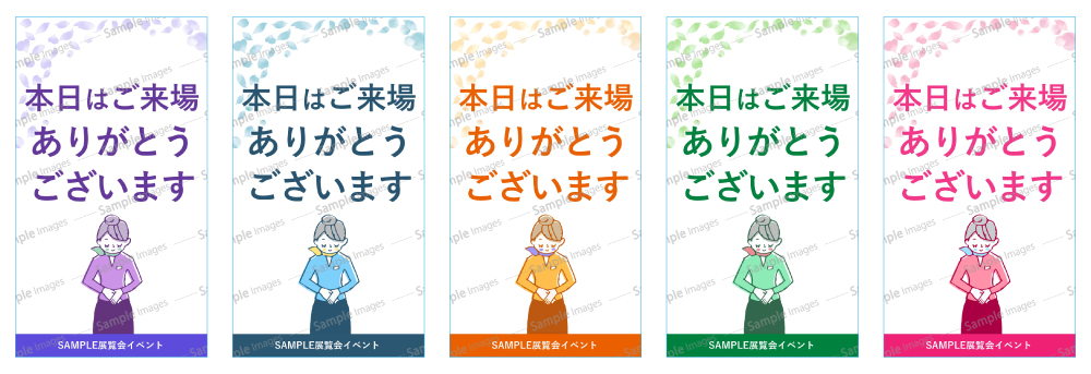 色調違いである「カラーバリエーション」のものから、デザインや字体、内容、背景などが異なるものまで、各テンプレートによってさまざまなバリエーションをご用意しています。たとえば、ご来場いただいたお客様に対して御礼の意を表示する場合では、表示する場所の雰囲気やシーン、お客様の属性、表示する時間帯などに合わせて最適なテンプレートを選択可能です。お客様にとって心地よいコンテンツをご提供することで、より丁寧なおもてなしを実現できます。