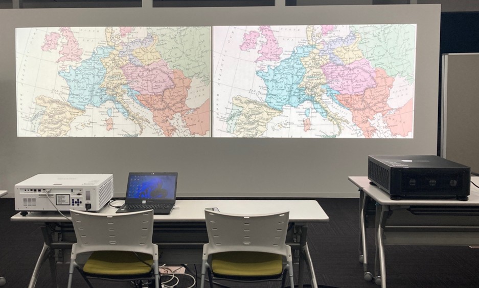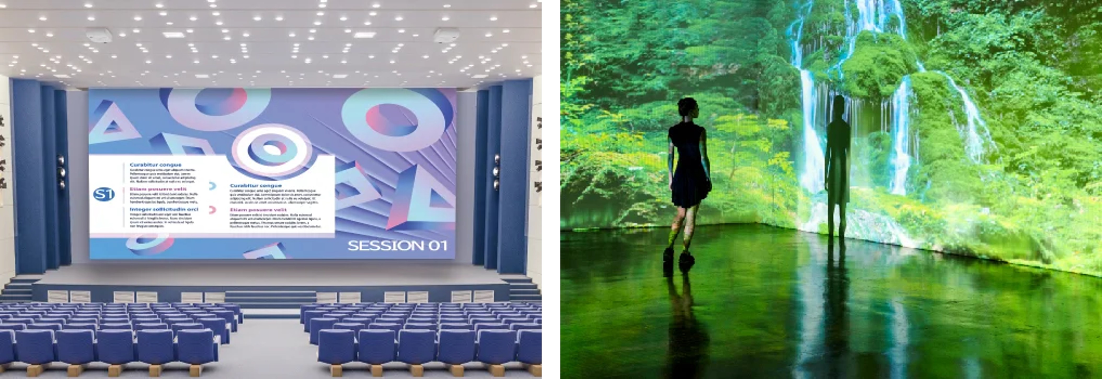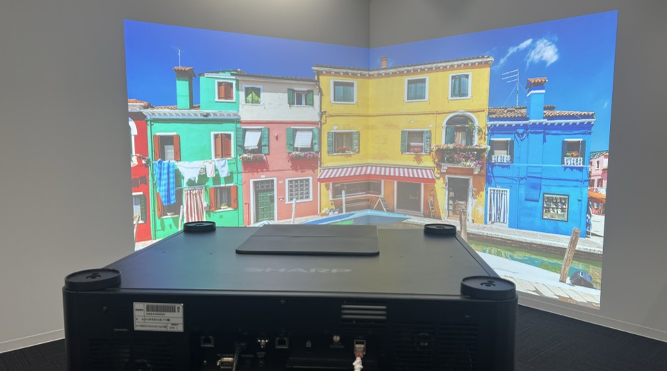 4月1日にリニューアルオープンした法人向けショールーム「3×3 Hub-東京」のプロジェクター専用の視聴ルーム「Projector Lab」では、各機種の投写比較やお持ちいただいたコンテンツの表示検証などでご活用いただけます。前後左右の壁面を活用した投写や壁面の角を利用した角打ち投写もでき、複数機種による投写比較や接続検証、動作検証もしていただけます。
