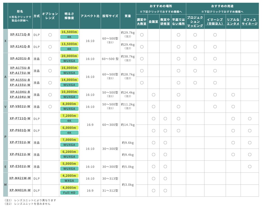 プロジェクターは投写方式(DLP/液晶)や明るさ、解像度などによりさまざまな種類に分かれます。また、投写可能な画面サイズや本体の質量などもさまざまです。さらに、使用する場所や用途によりおすすめ機種が異なります。これらを機種別に整理したものがシリーズ一覧表です。