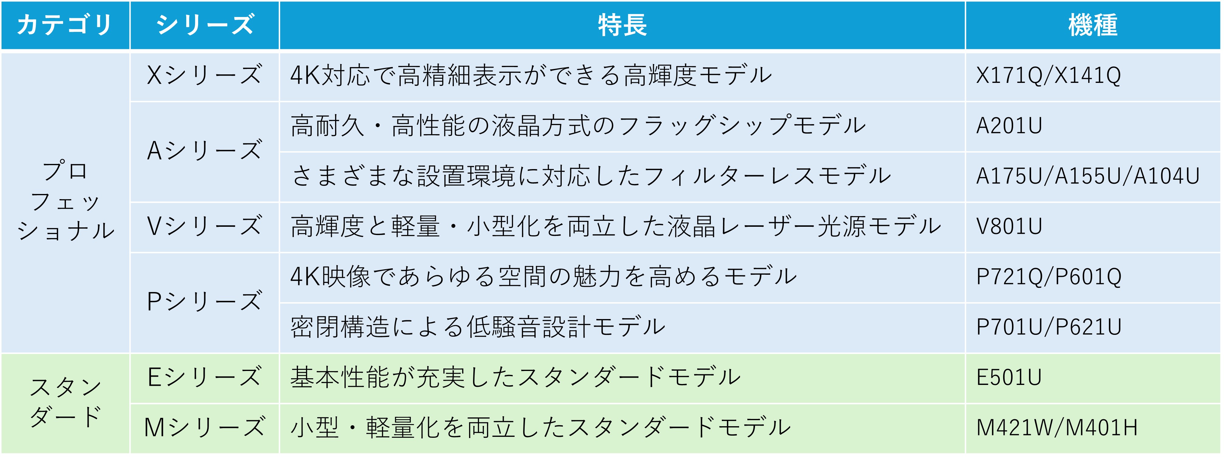 高輝度プロフェッショナルからスタンダードまで6シリーズに分類し、合計14機種を揃えています。