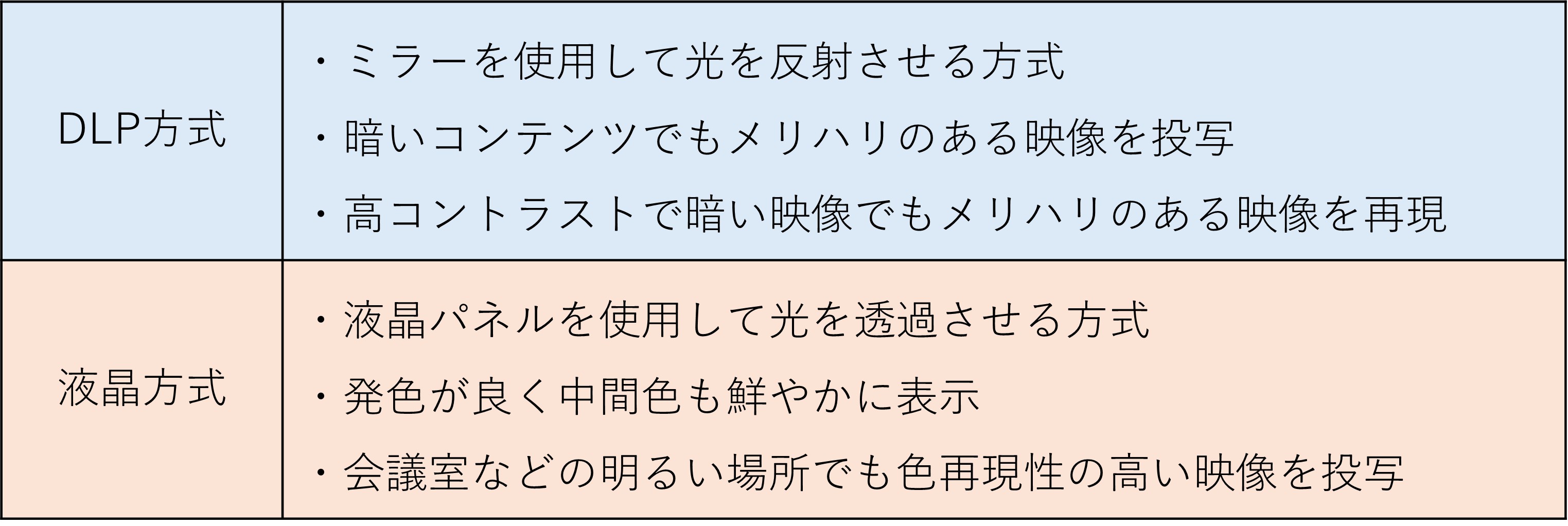 シャープは、DLP方式と液晶方式の2種類をラインアップしています。それぞれの投写方式の特長は下記です。
