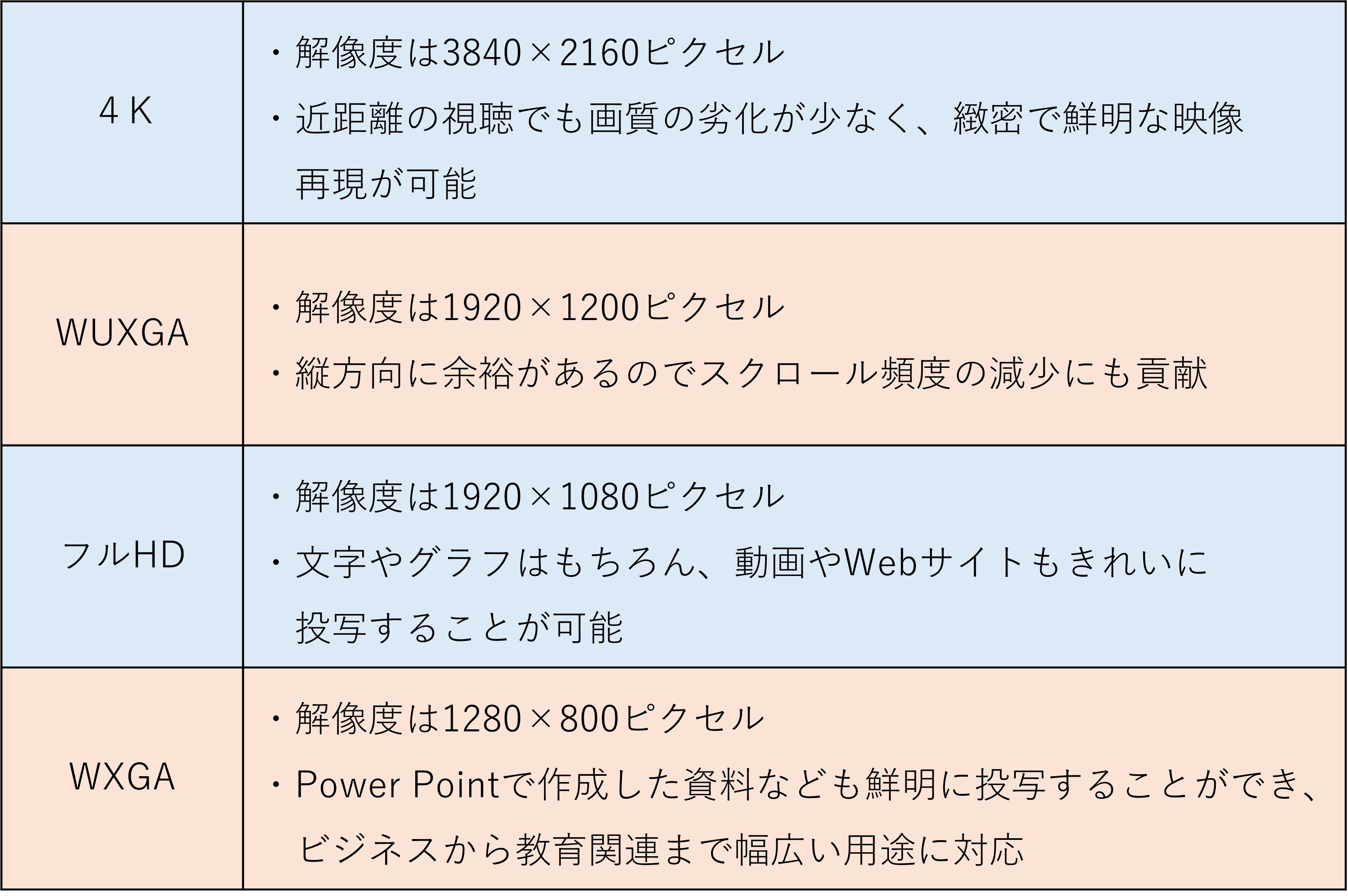 シャープのプロジェクターの解像度は、4K、WUXGA、フルHD、WXGAの4種類があります。それぞれの特長は下記です。