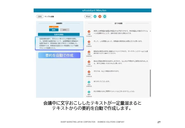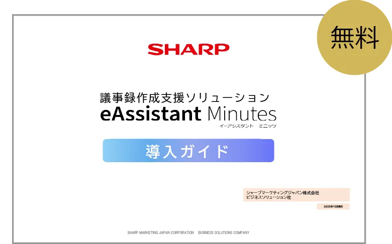 eAssistant Minutes 導入ガイド < > 本資料はこんな方におすすめします。 議事録の作成に時間をかけたくない方 会議中に議事録を作成したい方 クラウド利用だと情報漏洩が心配な方 ぜひ、ダウンロードしてお使いください。 は必須項目です。必ずご記入ください。機種依存文字および半角カタカナは使用できません。 全ての項目にご入力ください。 企業・団体名 企業・団体名を入力してください。 企業・団体名の入力が正しくありません。 部署名 部署名を入力してください。 部署名の入力が正しくありません。 お名前 お名前を入力してください。 お名前の入力が正しくありません。 e-mailアドレス e-mailアドレスを入力してください。 e-mailアドレスの入力が正しくありません。 電話番号 電話番号を入力してください。 電話番号の入力が正しくありません。 郵便番号 郵便番号を入力してください。 郵便番号の入力が正しくありません。 所在地※郵便番号入力で自動入力しますので、丁目・番地以降を追記ください。 入力された郵便番号から所在地を引き当てられませんでした。 所在地を入力してください。 導入時期 選択してください すぐに導入したい 半年以内に導入したい 1年以内に導入したい 具体的な導入時期は検討中 情報収集のみ 導入時期を選択してください。 導入時期の選択が正しくありません。 商品/システム導入時の役割り 商品/システム導入時のご自身の役割りについて、もっともあてはまるものを1つ選んでください。 商品/システムを選定し、導入を決定する立場 商品/システムを選定し、決裁者へ上申する立場 商品/システムの導入のみ決定する立場 上記にあてはまるものがない 役割りを選択してください。 個人情報取り扱いについて ご入力されたお客様の個人情報は、製品・サービス、イベントなどのご案内やマーケティング活動(メール配信を含む)を目的として利用いたします。 お客様の個人情報は、法令及び当社の内部規程に基づき管理いたします。 当社の個人情報の取り扱いにつきましては「個人情報の取り扱いについて」をご覧ください。 個人情報の利用にご同意いただける場合は、下記にチェックを入力後、「入力内容を確認」ボタンをクリックしてください。 個人情報の利用に同意する 個人情報の利用にご同意をお願いいたします。
